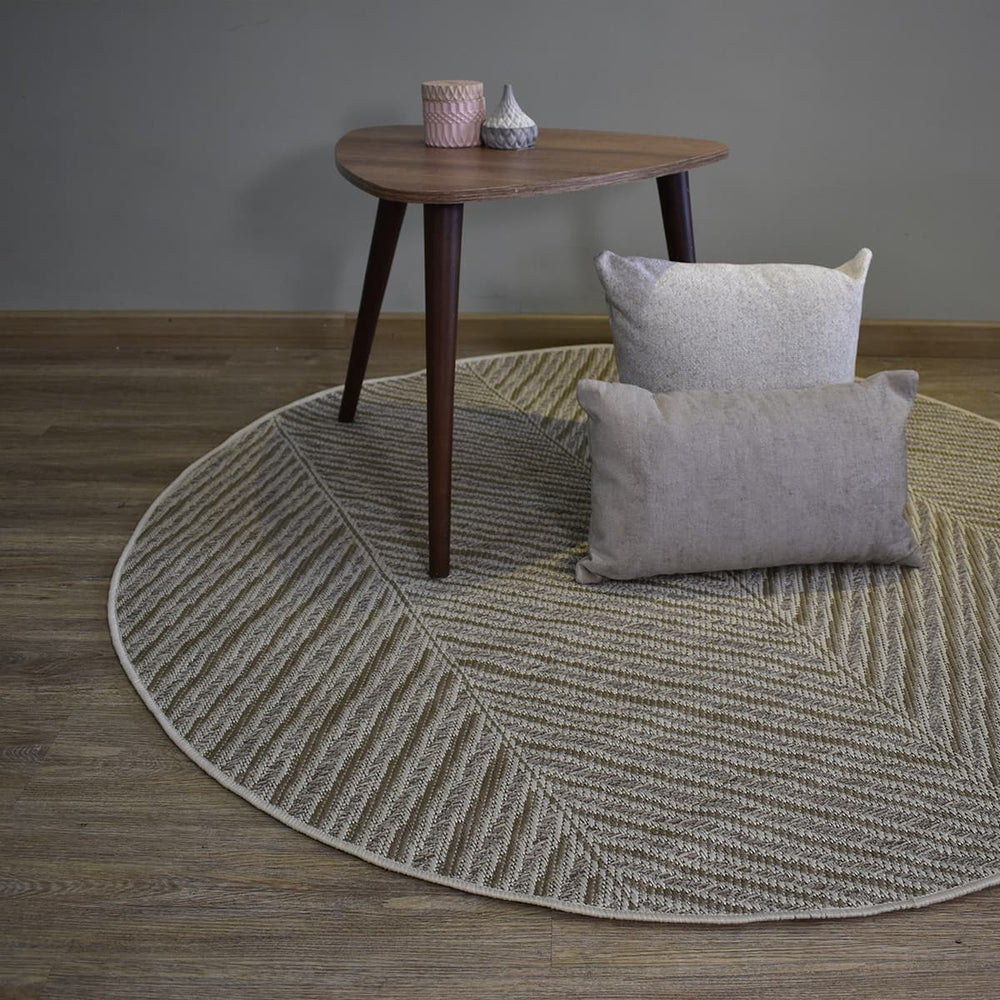 La alfombra redonda Condesa 01 en tono natural aporta calidez y estilo a cualquier ambiente con su diseño moderno de patrones diagonales. Ideal para salas, dormitorios o estudios gracias a su versatilidad y acabado textil de alta calidad.