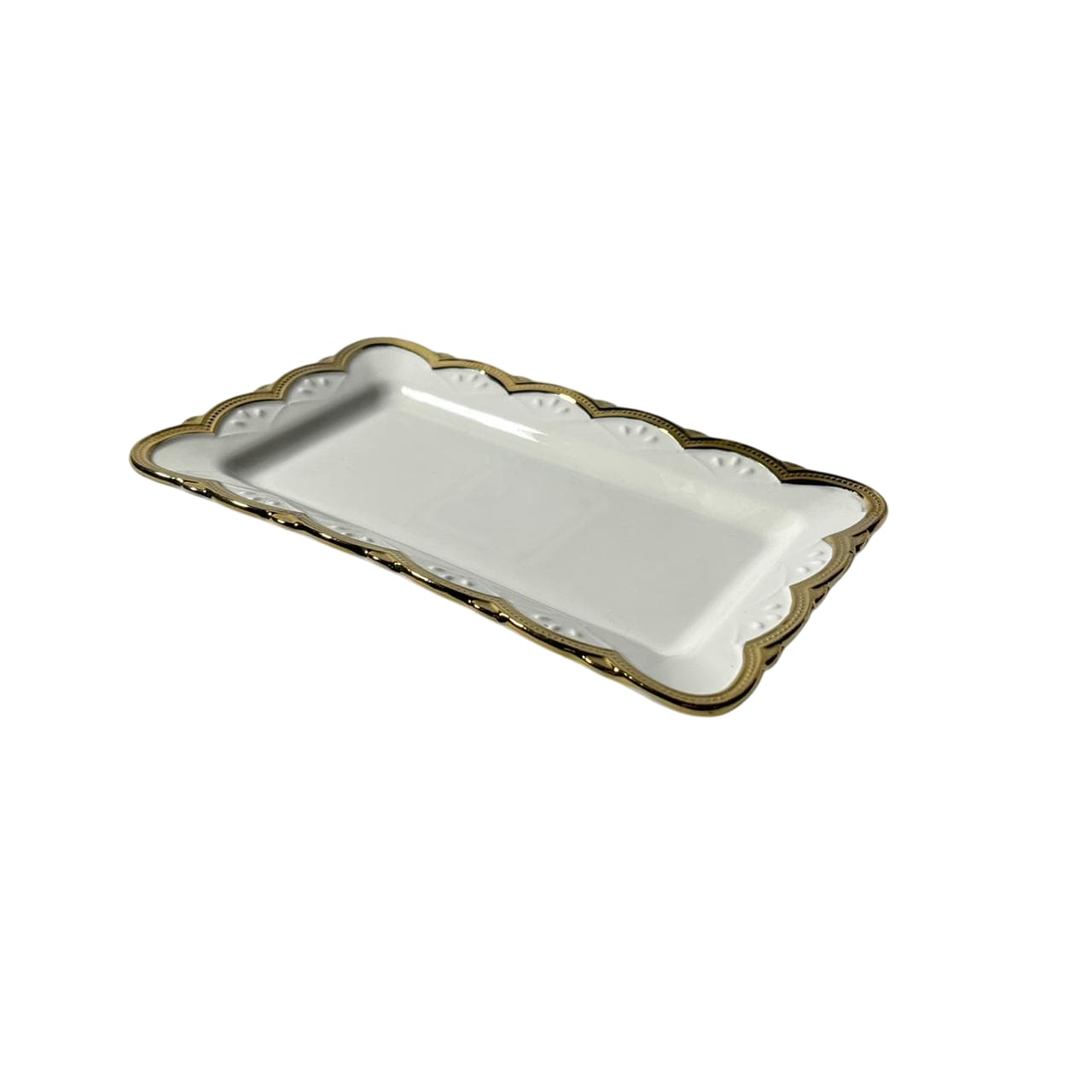 Disponible en dos tamaños (12x20 cm y 15x25 cm), esta bandeja puede utilizarse para organizar accesorios, servir pequeños bocadillos o exhibir adornos. El detalle dorado en los bordes realza su diseño, aportando un toque de lujo y distinción a cualquier espacio.