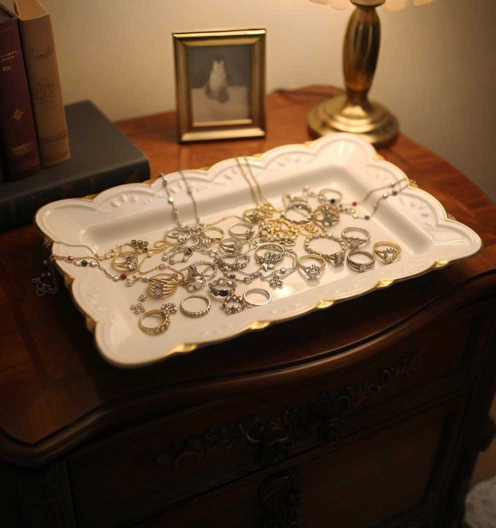 Añade un toque de elegancia y sofisticación a tu hogar con esta bandeja decorativa blanca con borde dorado ondulado. Su diseño refinado y su acabado brillante la convierten en una pieza ideal para decorar mesas, repisas o tocadores con un estilo clásico y moderno a la vez.
