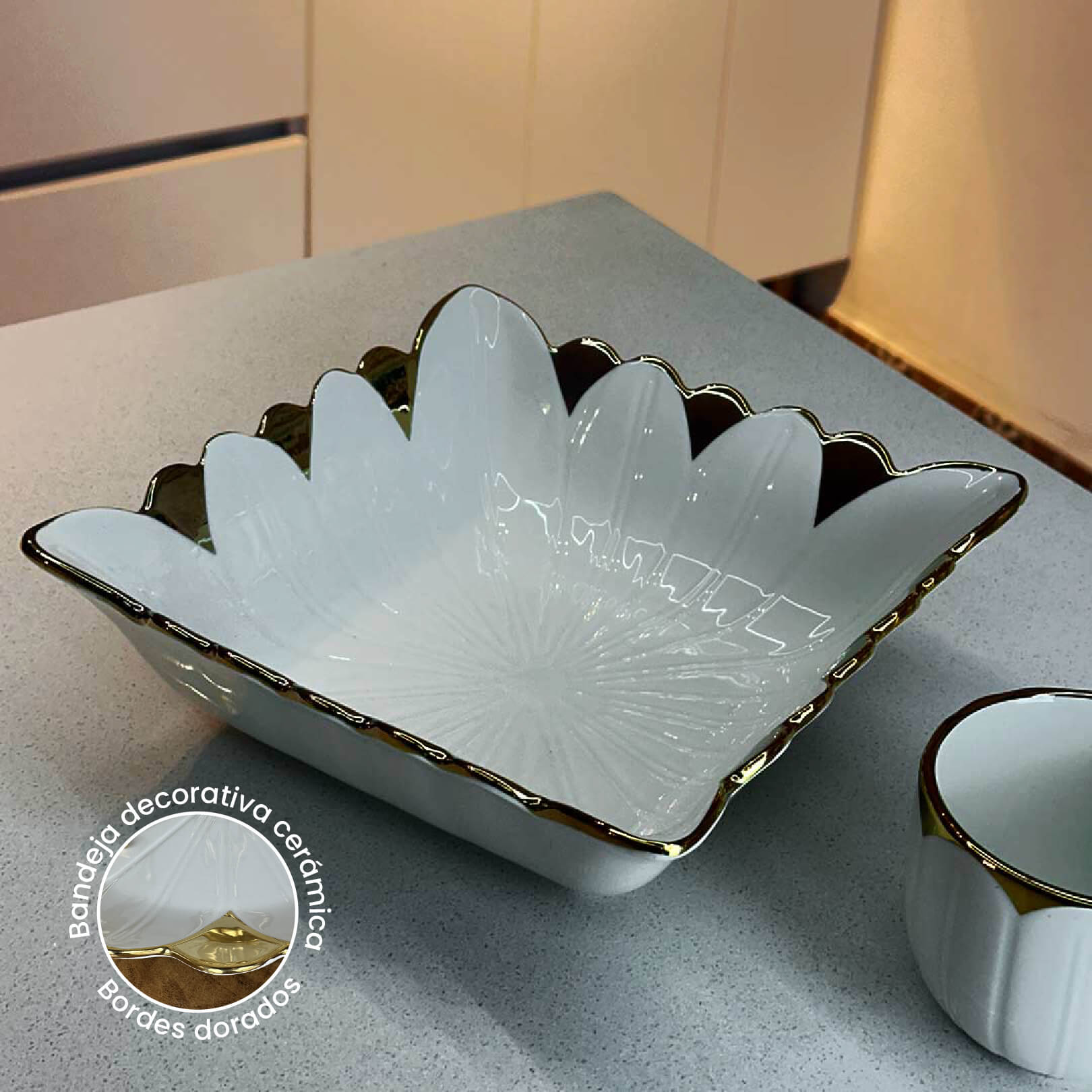 Es una pieza de lujo que aportará sofisticación a cualquier ambiente. Su diseño cuadrado con detalles en forma de flor y borde dorado resalta la elegancia de tu hogar, ideal para complementar tu decoración. ¡Haz que cada espacio luzca aún más encantador con esta bandeja exclusiva! Adquiérela ahora en Lala Home.