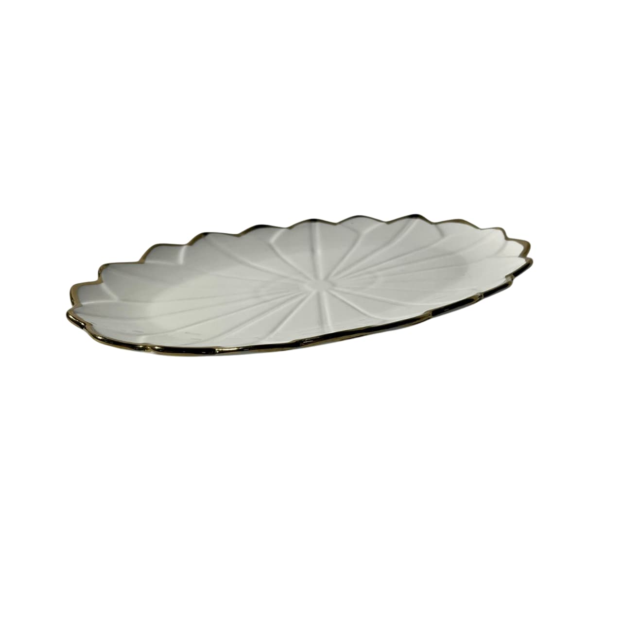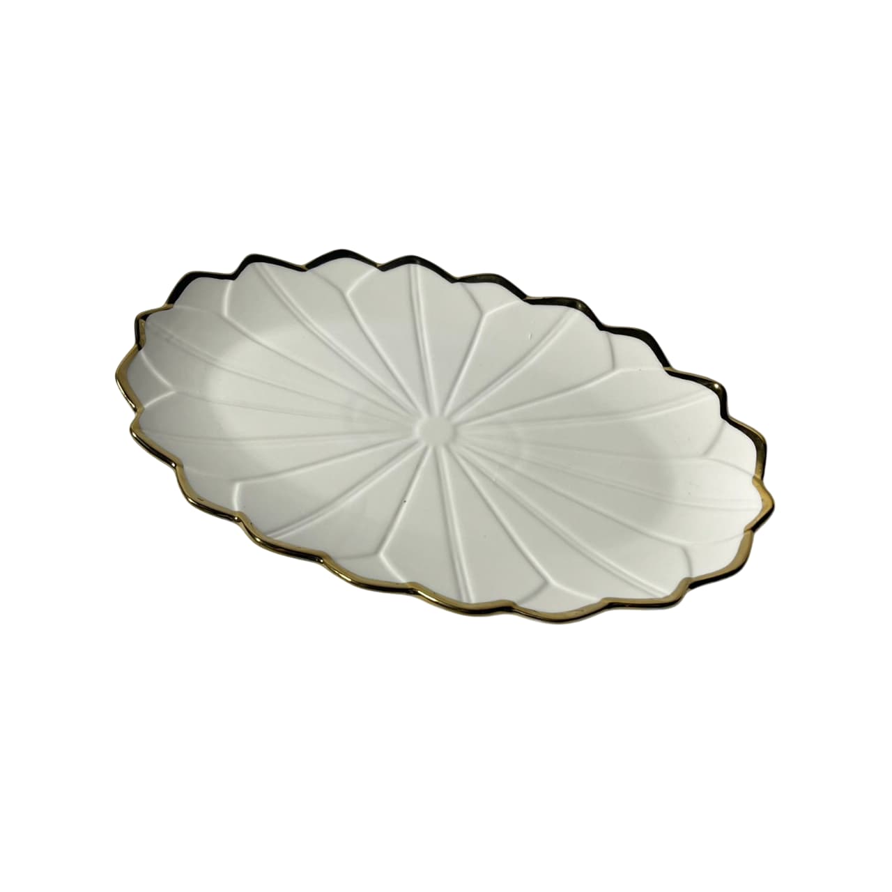Disponible en dos tamaños (15x26 cm y 19x30 cm), esta pieza puede usarse como centro de mesa, bandeja organizadora o decorativa. El borde dorado realza el acabado blanco brillante, aportando un contraste moderno y lujoso que se adapta a todo tipo de decoración.