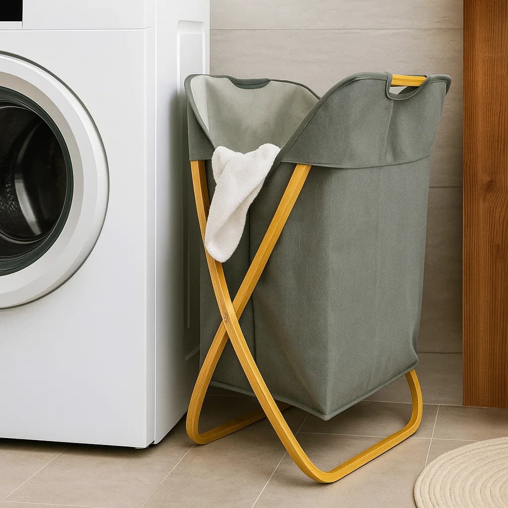 Organiza tu ropa con estilo gracias a esta cesta de lavandería de gran altura, con estructura de bambú resistente y tela con diseño de líneas modernas. Perfecta para espacios reducidos por su diseño vertical, combina elegancia y funcionalidad.