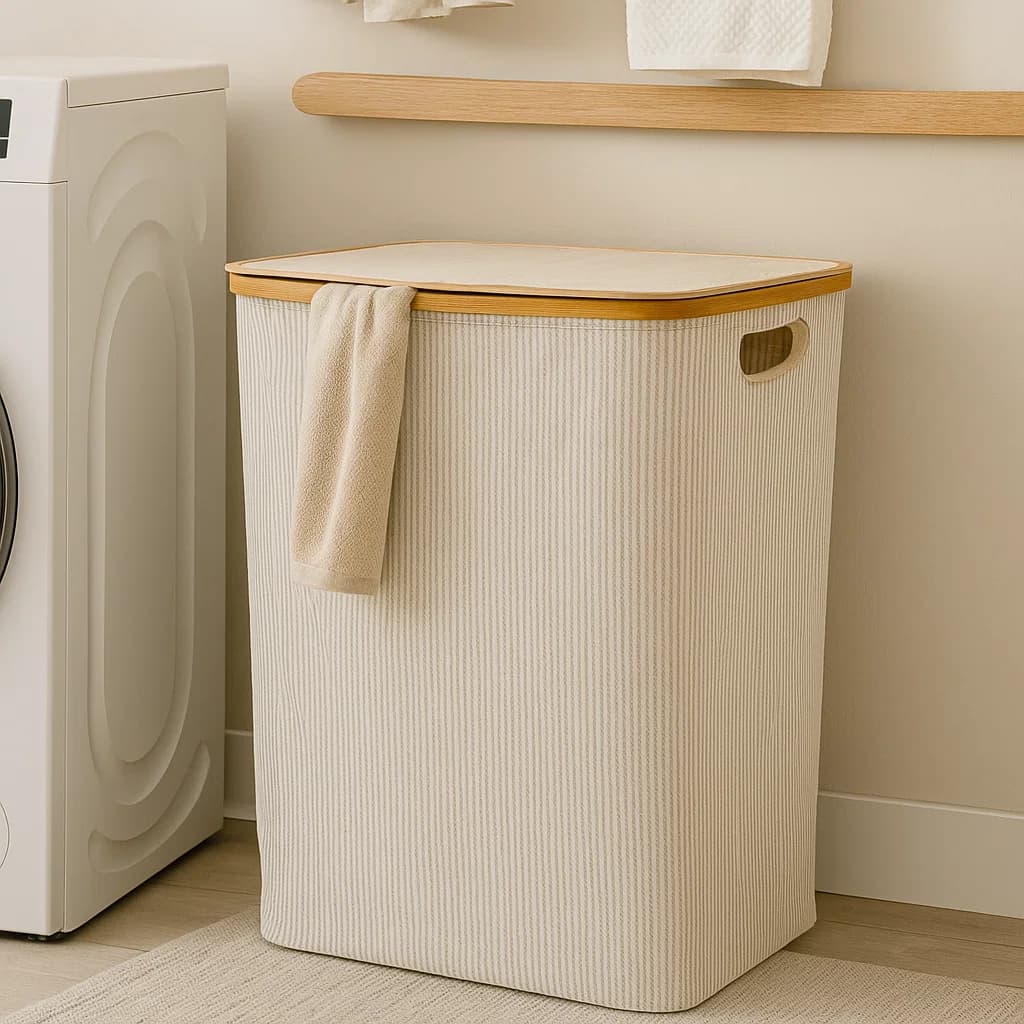 Mantén tu ropa sucia organizada con esta cesta de lavandería grande, ideal para familias o espacios con mayor volumen de ropa. Su diseño a rayas y marco de bambú la hacen una opción funcional y decorativa para cualquier hogar.