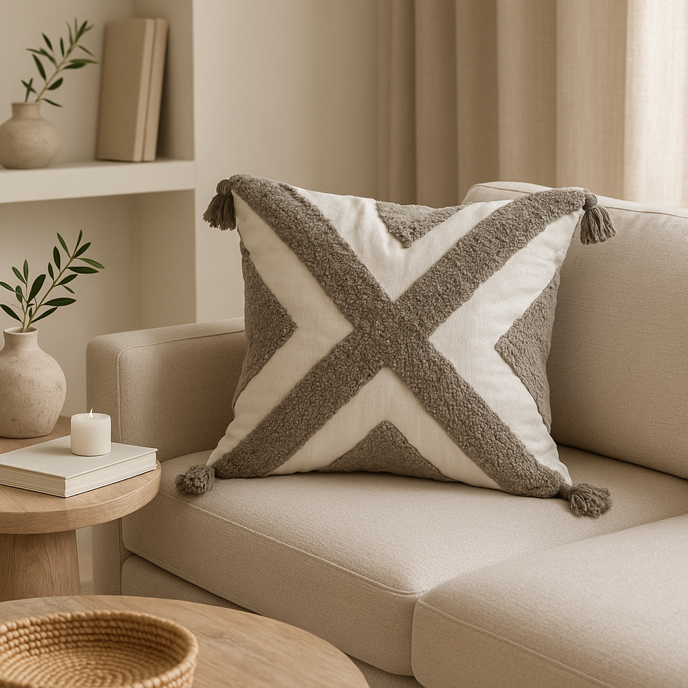 Renueva tu espacio con este elegante cojín blanco con acentos en marrón taupe de 45×45 cm. Su combinación de tonos claros y terrosos aporta sofisticación y calidez a sofás, sillones o camas, creando un ambiente armonioso y acogedor. El relleno de alta calidad garantiza confort y mantiene la forma con el uso diario.