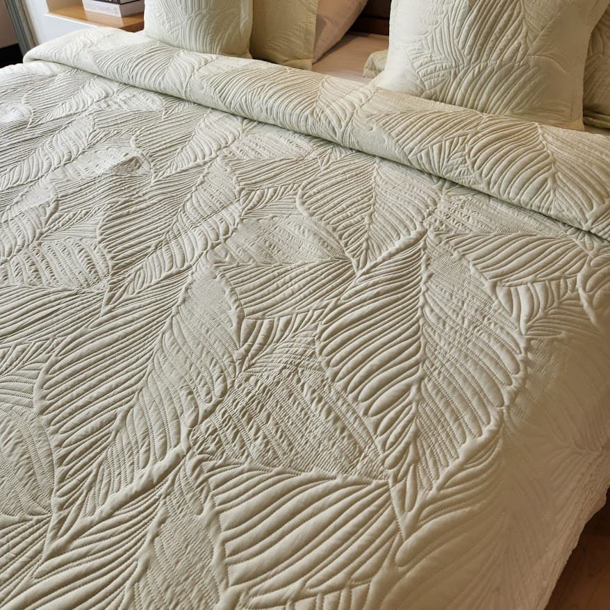 El edredón bordado superior hojas otoño beige combina elegancia y confort en una pieza única para transformar tu dormitorio. Su diseño con delicadas hojas en relieve evoca la calidez del otoño, creando un ambiente acogedor y sofisticado con un toque natural.