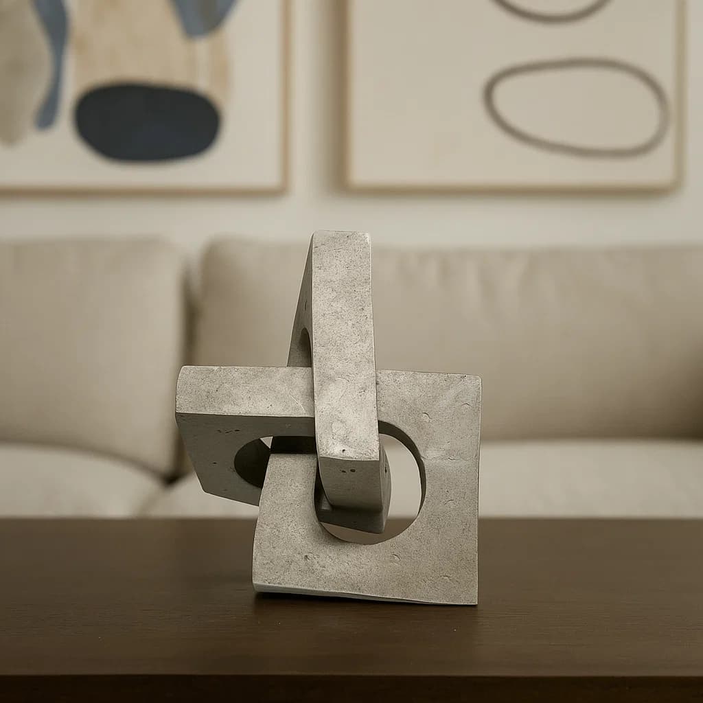 Dale un giro vanguardista a tu decoración con esta escultura geométrica moderna. Su diseño entrelazado de figuras cuadradas con textura tipo concreto aporta un estilo elegante y contemporáneo a cualquier espacio.