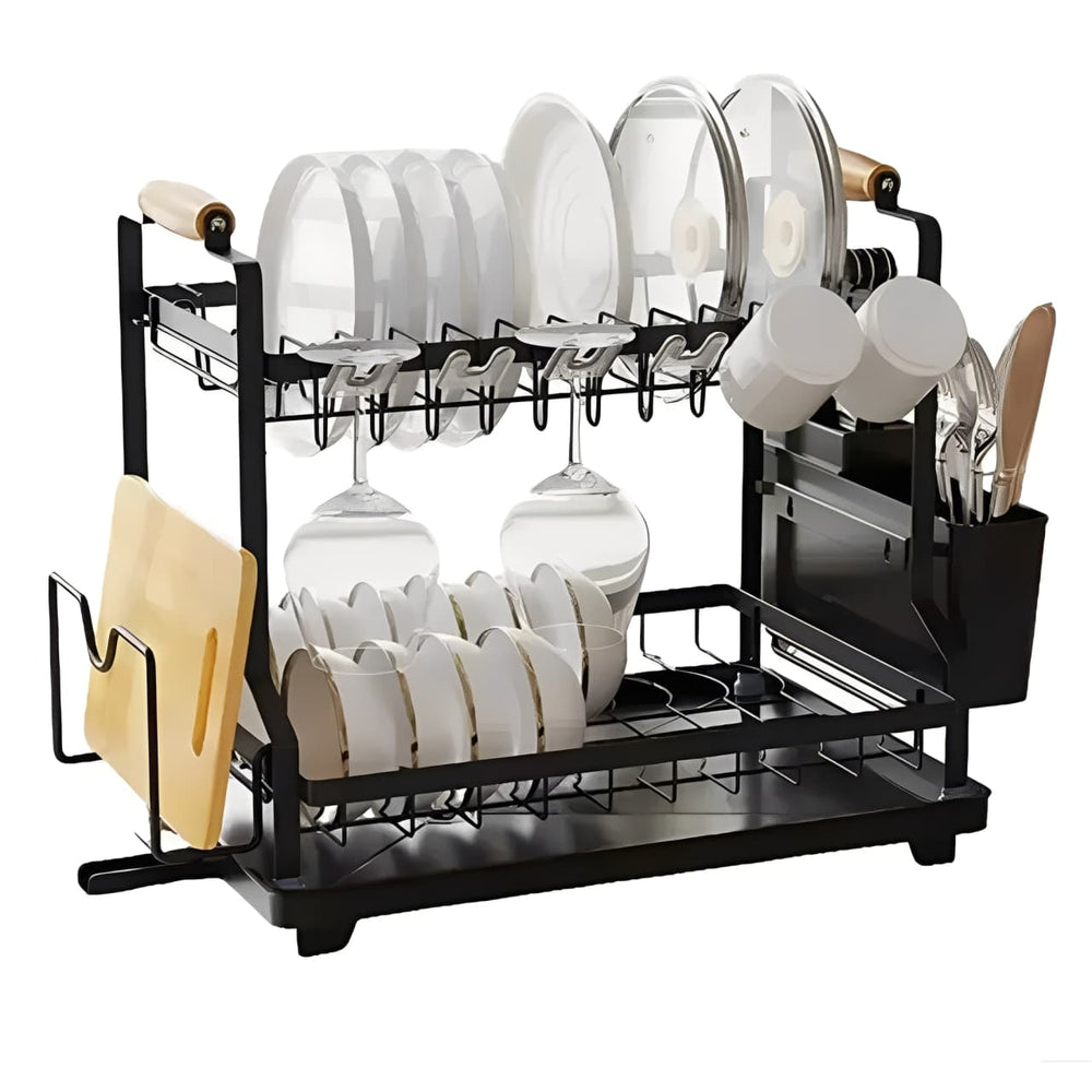 Organiza tu cocina de forma práctica y elegante con este escurridor de loza metálico de dos niveles. Su estructura de metal con recubrimiento resistente y agarraderas en madera lo hacen funcional y decorativo.