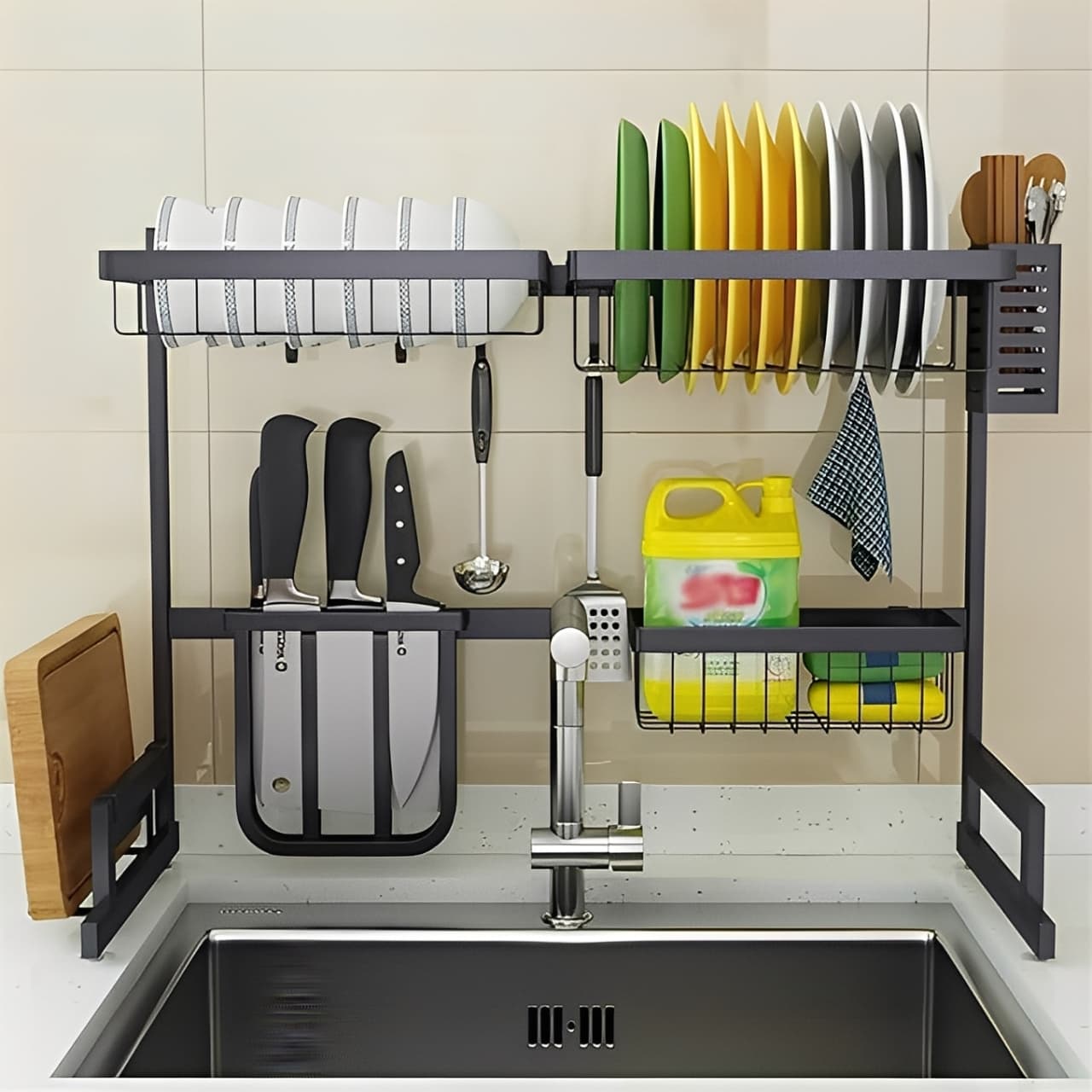 Maximiza el espacio de tu cocina con este escurridor de loza metálico de 2 niveles en elegante color negro. Su diseño tipo puente permite colocarlo sobre el fregadero para aprovechar al máximo el área de lavado, sin sacrificar funcionalidad ni estilo.