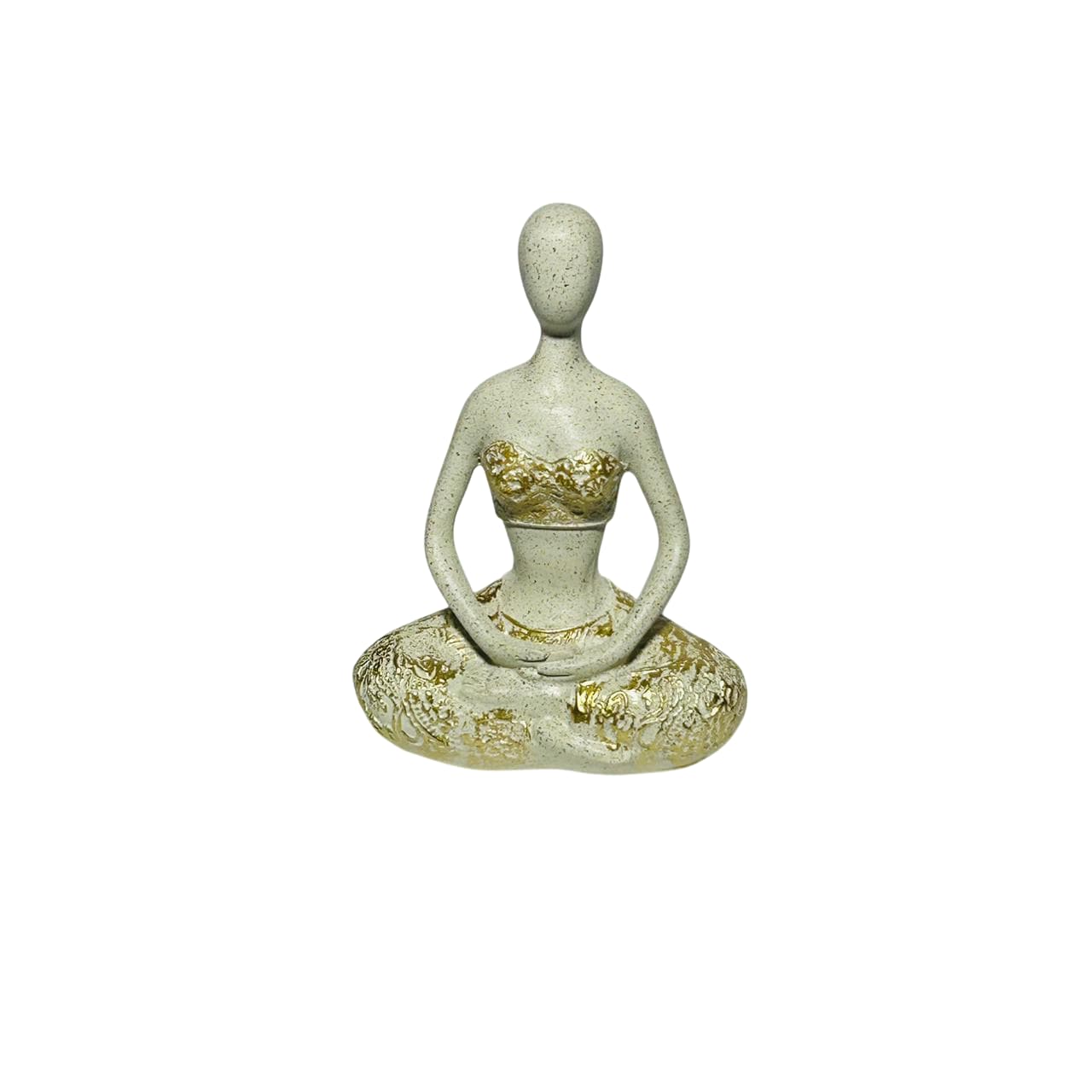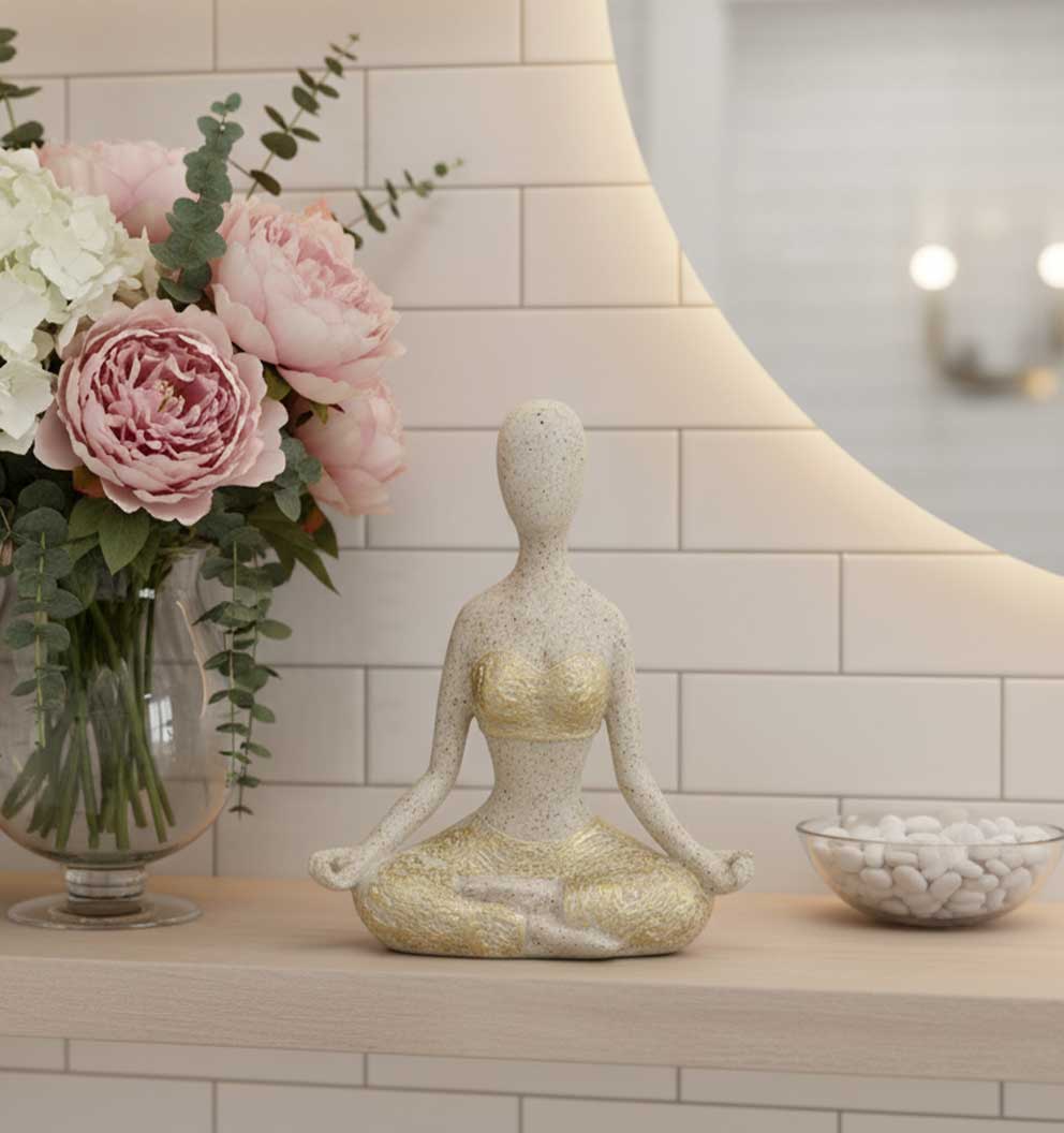Inspira calma y equilibrio en tus espacios con esta figura decorativa de mujer en posición de meditación. Su acabado en tonos neutros con detalles dorados evoca paz y armonía, siendo ideal para espacios de relajación, yoga o decoración espiritual con un toque moderno.