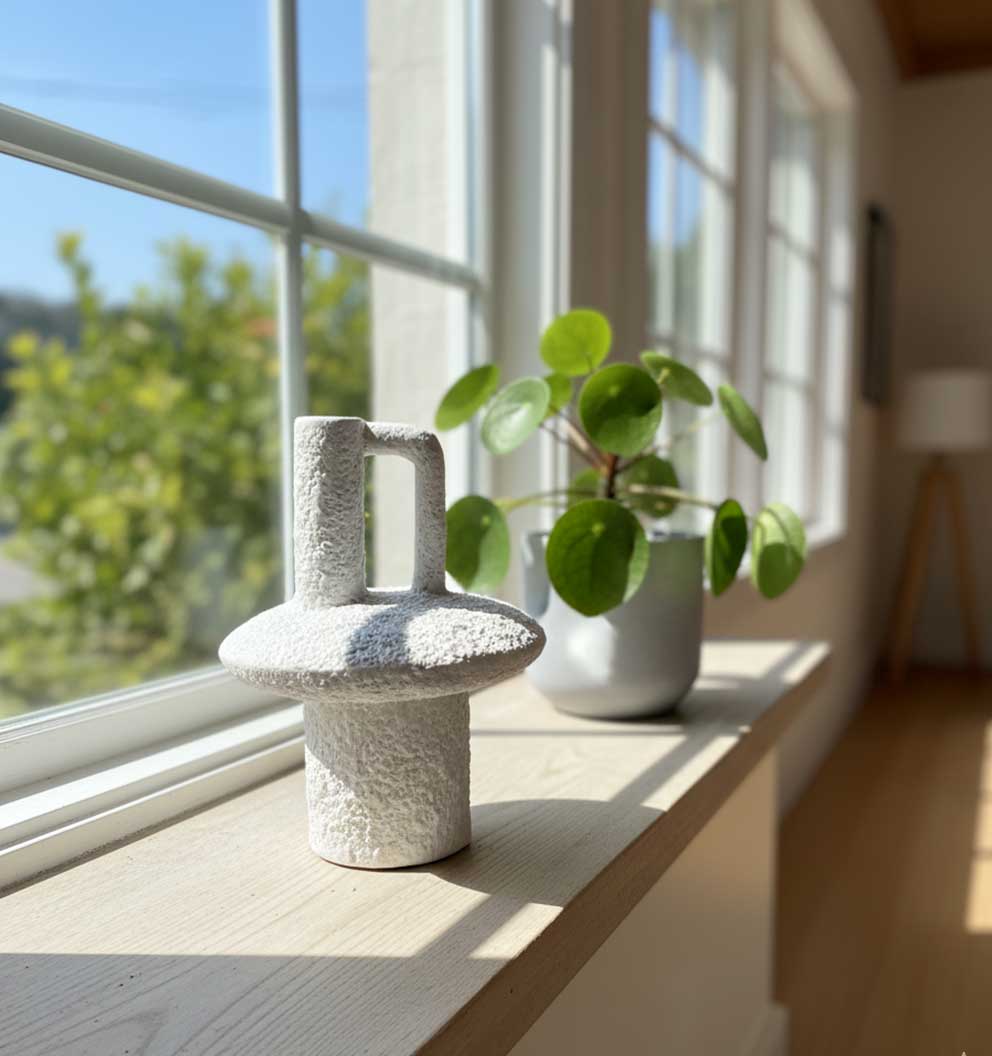 Añade un toque de originalidad a tu decoración con este florero de cerámica rústico. Su diseño circular con asa integrada y acabado texturizado lo convierten en una pieza única ideal para ambientes modernos o minimalistas.