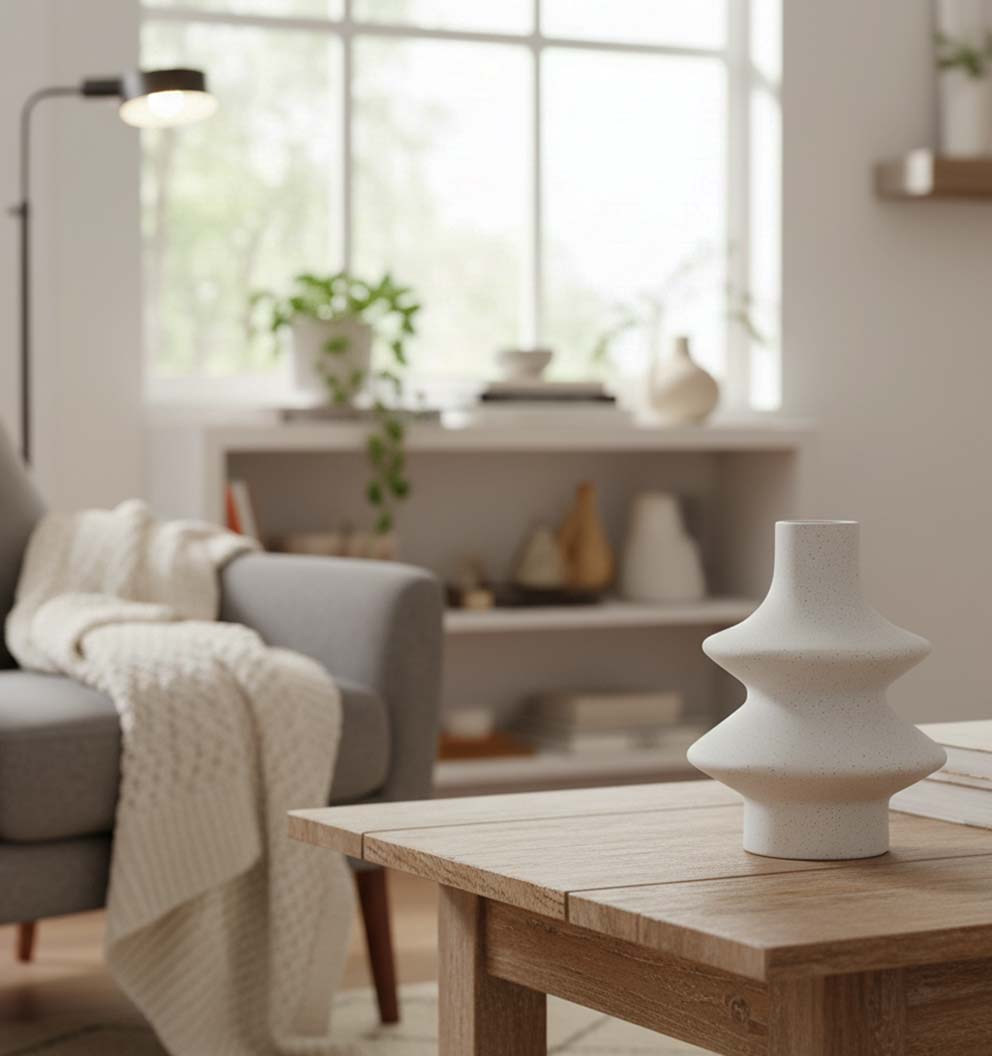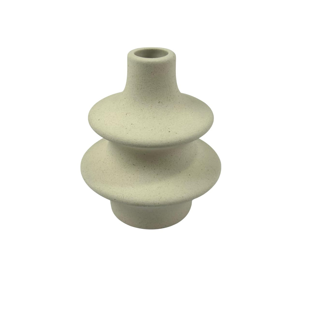 Este florero de cerámica con diseño escalonado combina formas geométricas con una estética minimalista. Su acabado blanco moteado aporta elegancia y un aire artesanal, ideal para decorar espacios modernos o nórdicos.