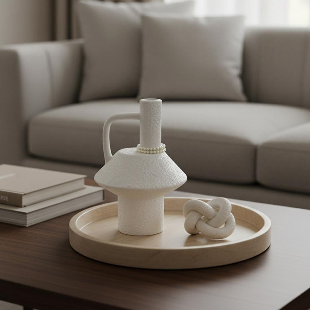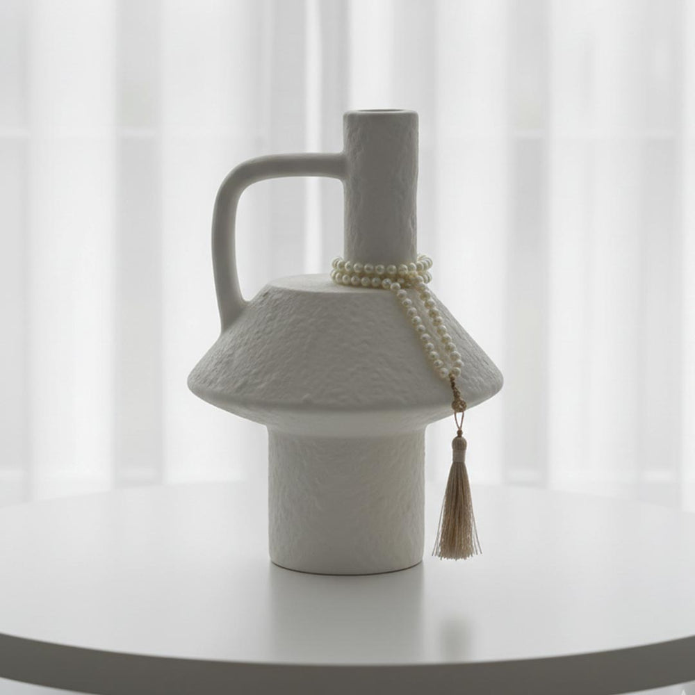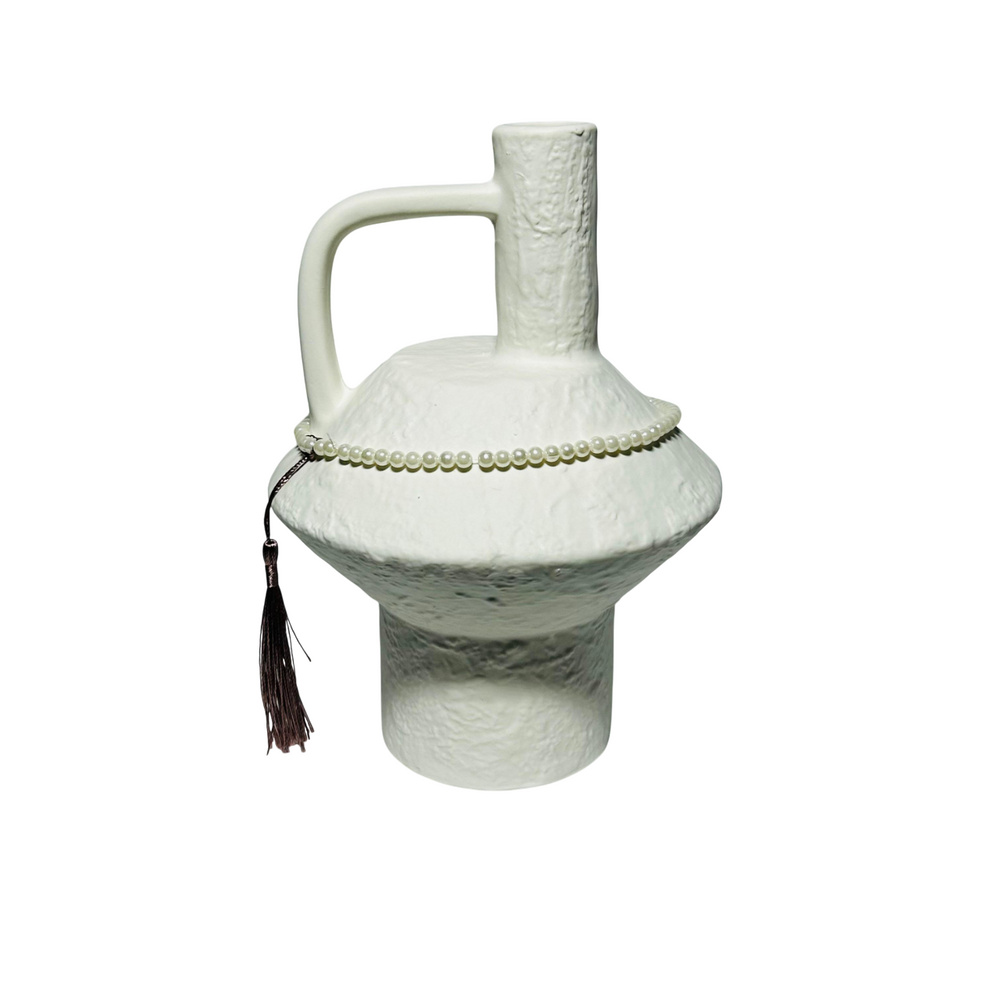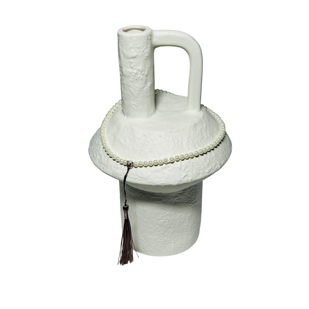 Aporta un toque de diseño sofisticado a tu hogar con este florero de cerámica blanco tipo hongo con detalle de perlas. Su forma escultórica recuerda la silueta orgánica de un hongo, con acabado mate y textura cuidada, mientras la guirnalda de perlas aporta un aire elegante y decorativo.