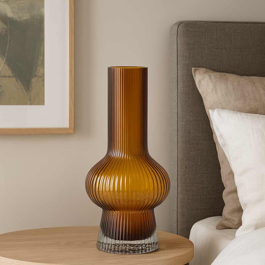 El Florero de Cristal Tipo Probeta en tono ámbar y diseño con líneas verticales es una pieza ideal para decoraciones modernas y sofisticadas. Disponible en dos tamaños, permite crear armonía visual en diferentes espacios.