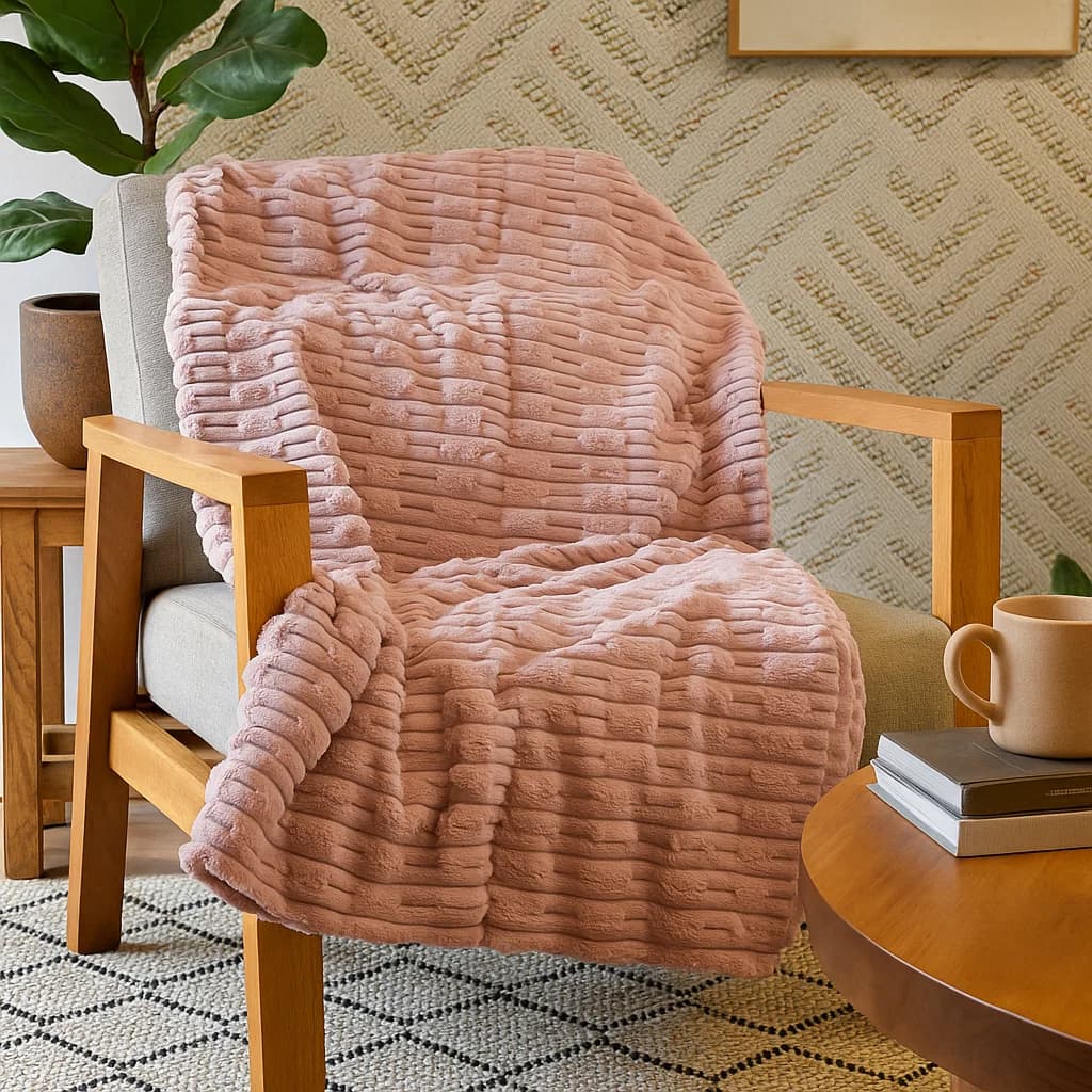 Dale calidez y estilo a tu hogar con la Frazada Gaudí 703 de 1.25 × 1.50 m en color palo rosa. Su textura acanalada en relieve aporta volumen decorativo y un tacto muy suave, perfecta para usar en sofá, sillón o a pie de cama.