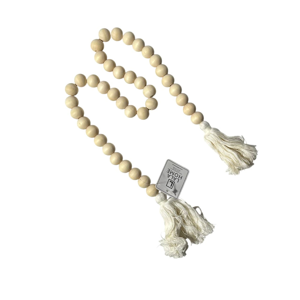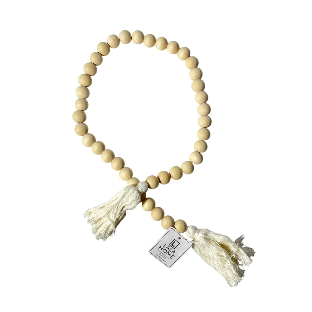 Decora tus espacios con un toque cálido y artesanal gracias a la guirnalda decorativa con borlas y flecos en tono beige. Su diseño elaborado con cuentas de madera natural y borlas de hilo grueso la convierte en una pieza versátil y elegante para complementar cualquier ambiente.