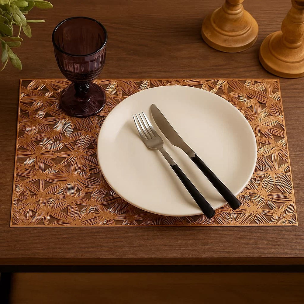 Fabricado en PVC de alta calidad, este individual es duradero, fácil de limpiar y resistente al calor moderado. Su diseño calado de hojas entrelazadas ofrece una apariencia moderna y refinada que permite destacar la vajilla y los colores de tu decoración.