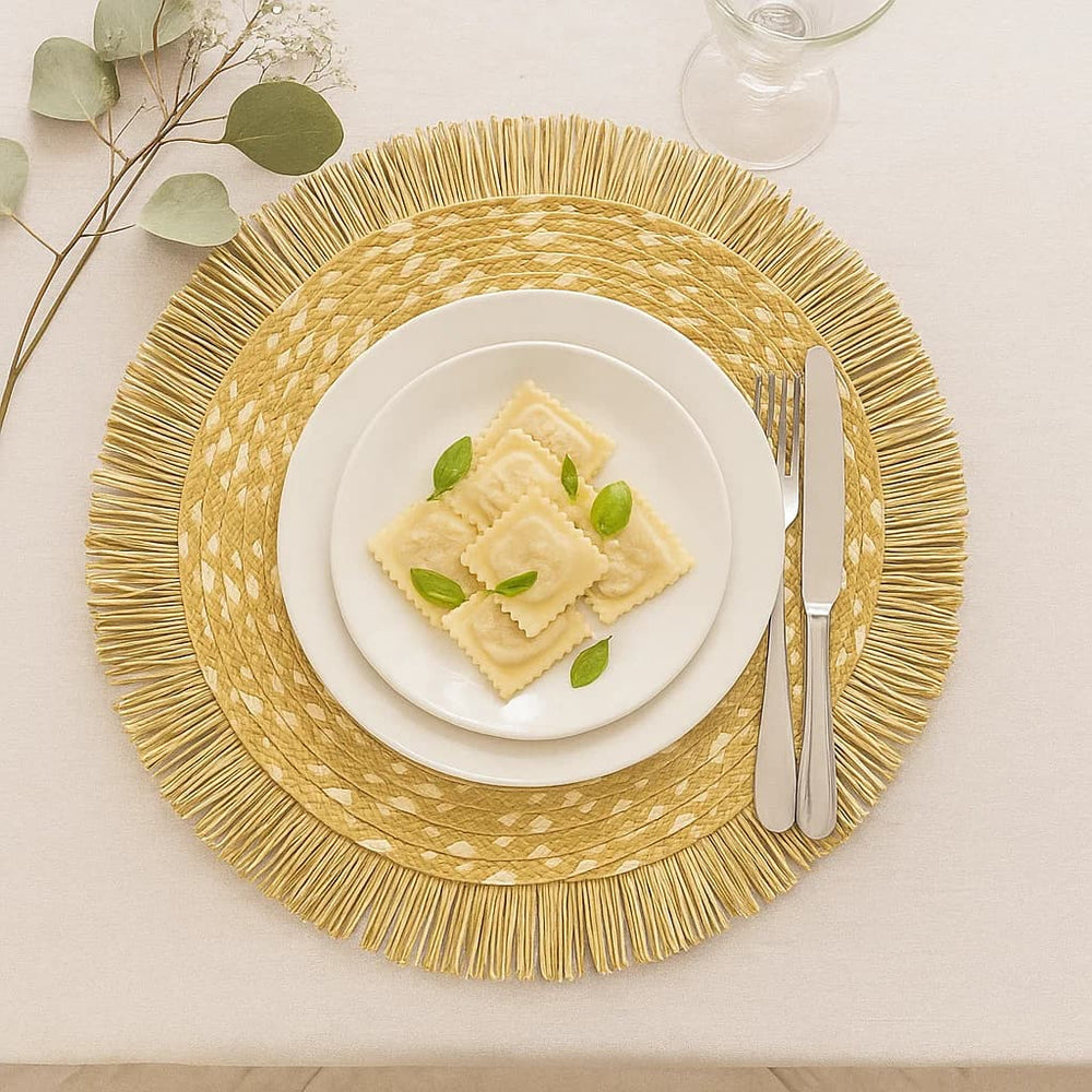 Complementa tu mesa con encanto natural gracias a este individual redondo en mimbre de 38 cm, elaborado con un diseño artesanal bicolor con flecos. Su mezcla de tonos tierra y fibras claras tejidas a mano crea un efecto visual cálido y elegante, ideal para espacios con estilo rústico, boho o contemporáneo.