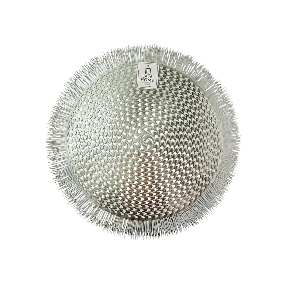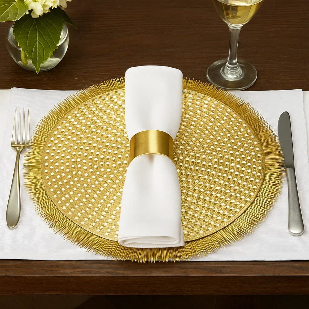 Añade un toque de sofisticación y brillo a tu mesa con este individual redondo en PVC de 38 cm con diseño de puntas en flecos. Su acabado metálico y estructura tejida lo convierten en un accesorio ideal para destacar cualquier ocasión especial o darle estilo a tu mesa diaria.