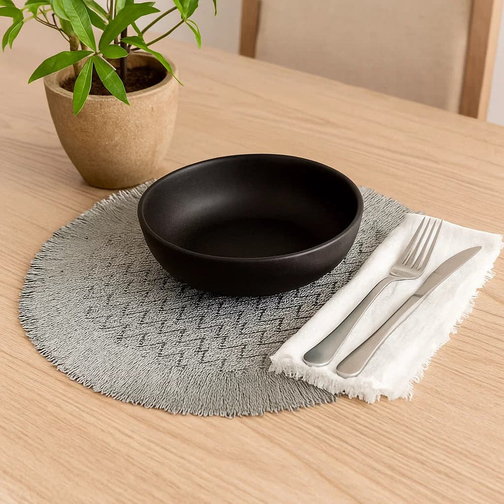Añade elegancia y estilo a tu mesa con este individual redondo de 38 cm en PVC, con diseño zig zag y borde con puntas decorativas en acabado dorado. Ideal para comidas diarias o eventos especiales.