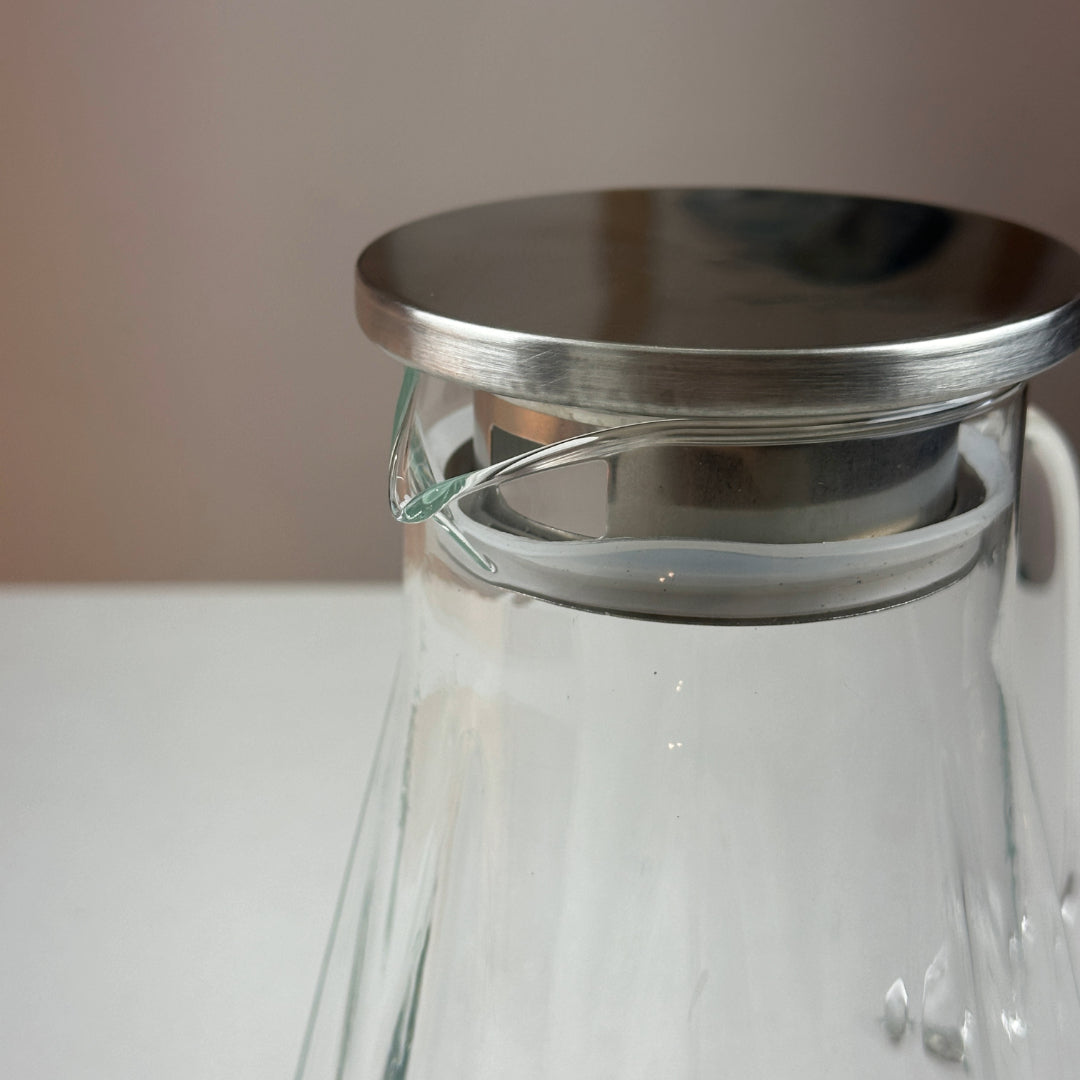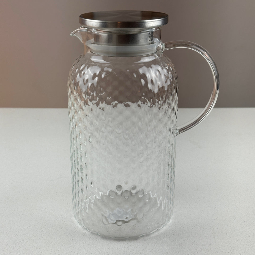 Esta jarra de 1800ml con tapa de acero inoxidable tiene un diseño de burbujas que la hace moderna y atractiva. Perfecta para bebidas frías o calientes, su tapa asegura que el contenido se mantenga seguro y fresco.