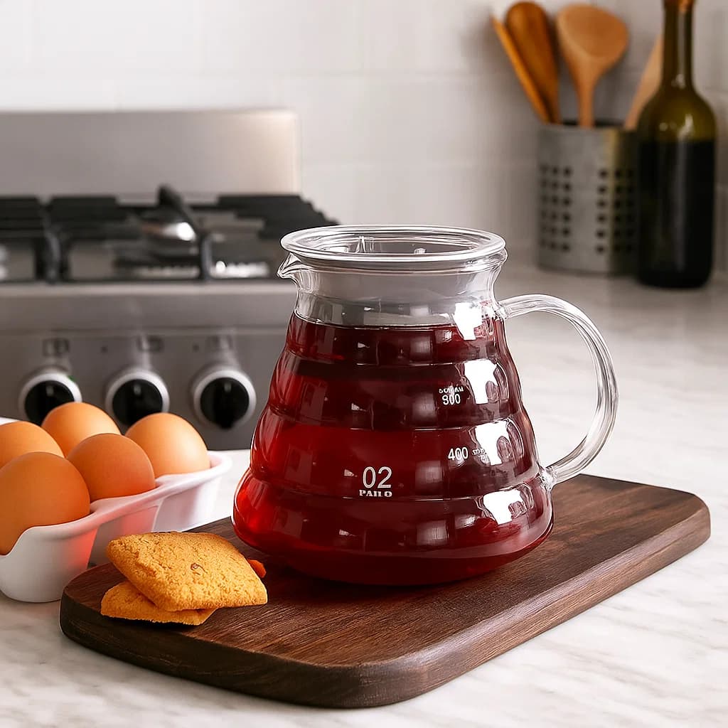 Prepara y sirve café con estilo y funcionalidad usando esta jarra de vidrio borosilicato de 800 ml, ideal para métodos como V60, Chemex o infusión directa. Fabricada con vidrio resistente al calor, ofrece durabilidad, claridad y elegancia en cada uso.