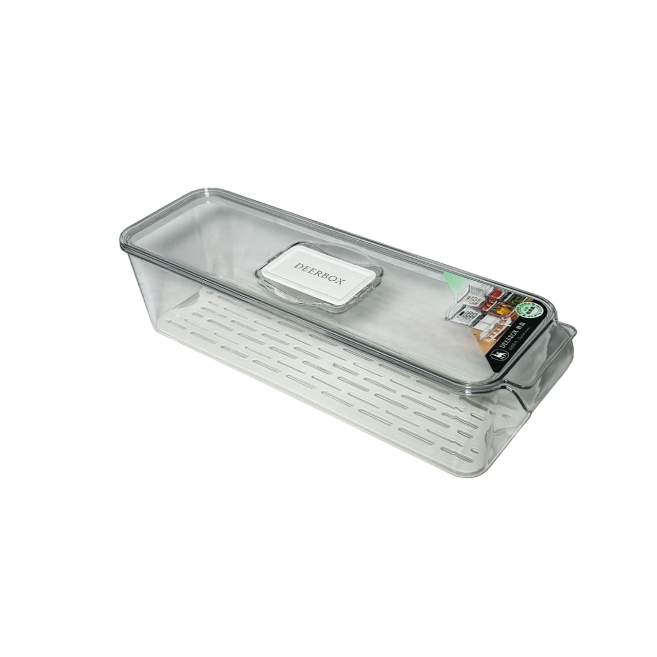 Mantén tus alimentos organizados en espacios estrechos con el organizador de nevera con tapa en acrílico de 9 × 34 × 11 cm. Su forma alargada y estrecha lo hace perfecto para almacenar vegetales largos, botellas, snacks o frascos, optimizando cada rincón de tu refrigerador.