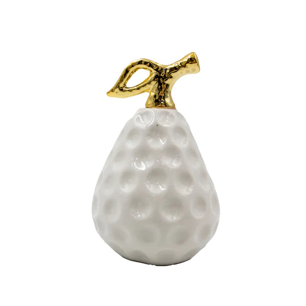 Aporta un toque sofisticado y contemporáneo a tus espacios con la pera decorativa en cerámica de 11 x 8 cm. Disponible en acabados plateado y dorado, su diseño texturizado con relieve crea un efecto brillante y llamativo, ideal para destacar en salas, comedores, oficinas o dormitorios.