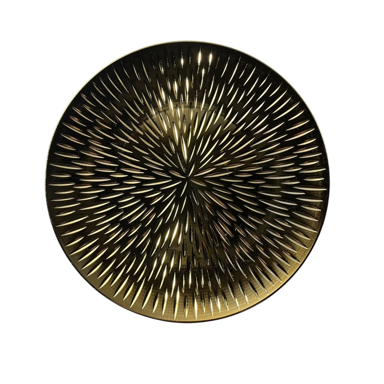Haz brillar tu mesa con el plato base de 32 cm con diseño de destellos en relieve dorado. Su patrón central tipo explosión radial crea un juego de luces y texturas ideal para destacar cualquier vajilla en eventos, celebraciones o cenas formales.