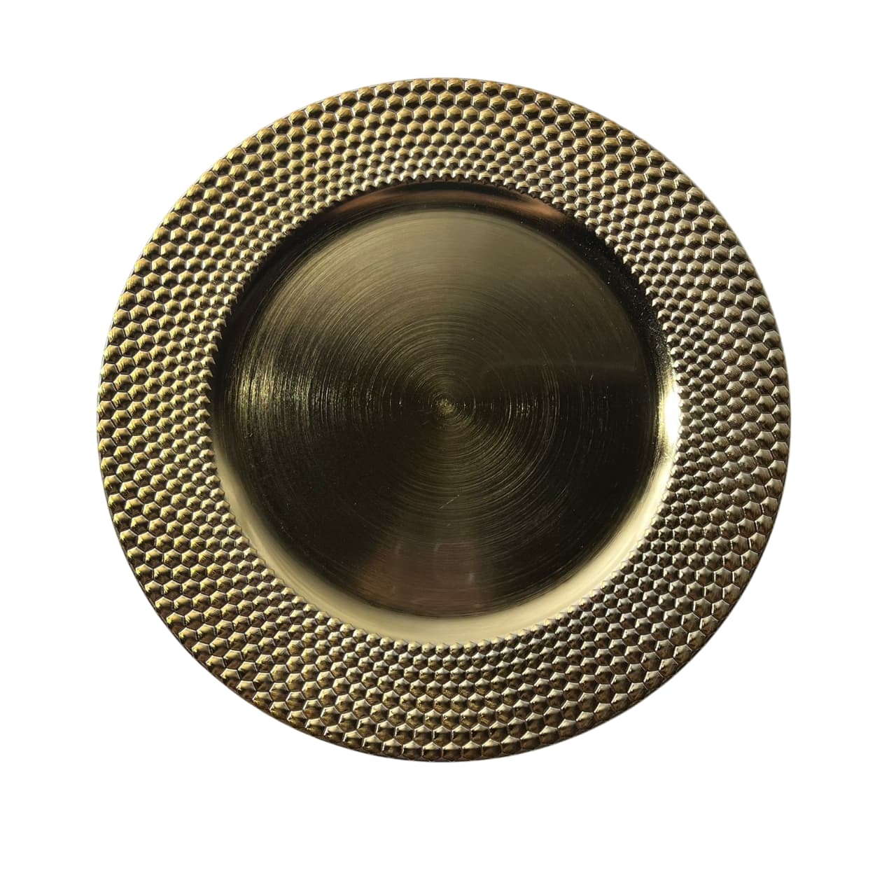 Aporta un aire moderno y sofisticado a tu mesa con el plato base de 32 cm con diseño geométrico en relieve dorado. Su textura exterior de patrones repetitivos y su acabado metálico hacen de este plato una pieza decorativa funcional y visualmente impactante.