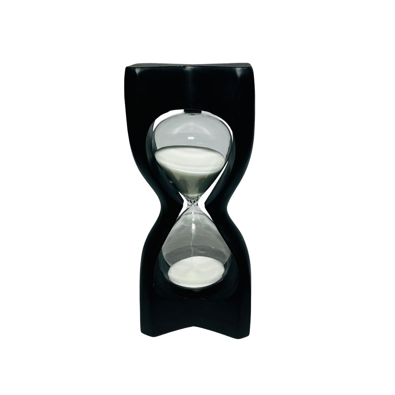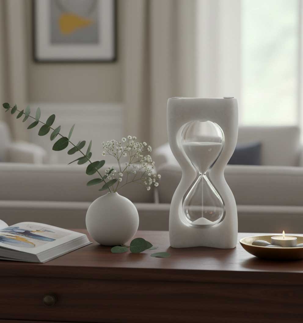 Este reloj de arena decorativo con base escultórica combina funcionalidad y arte moderno. Su diseño curvo con textura rugosa y acabado mate en colores neutros (blanco, negro o gris) lo convierte en una pieza perfecta para oficinas, estanterías o mesas de centro.