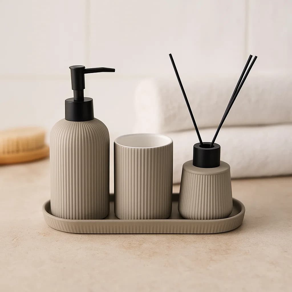 Renueva tu espacio con este set de baño de 4 piezas en color gris, ideal para baños con estilo moderno. Su diseño con líneas verticales aporta elegancia y organización.