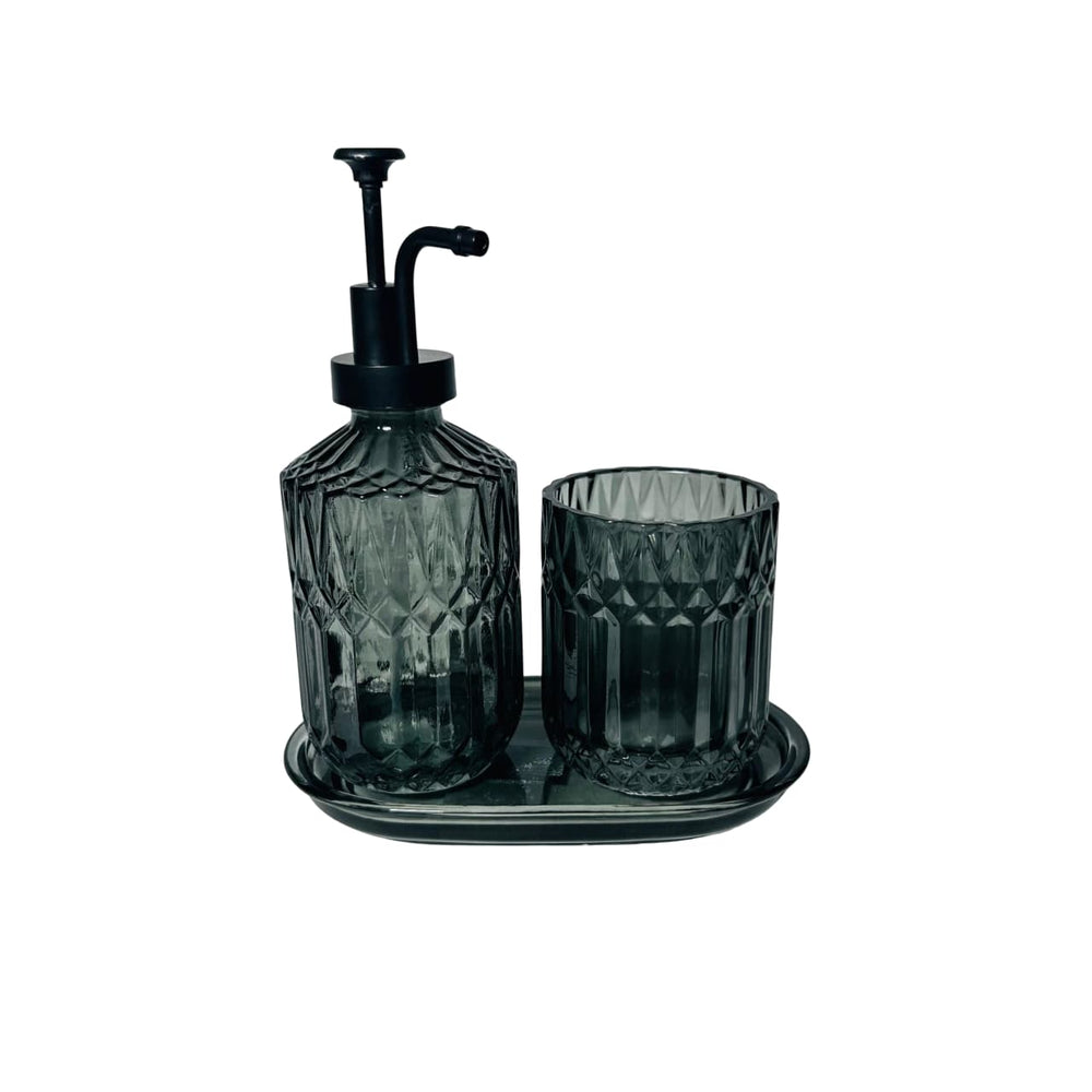 Aporta un toque sofisticado a tu baño con el set de baño x3 diseño rombos azul oscuro. Su diseño tallado en vidrio le da un acabado moderno y elegante, ideal para baños contemporáneos o clásicos.
