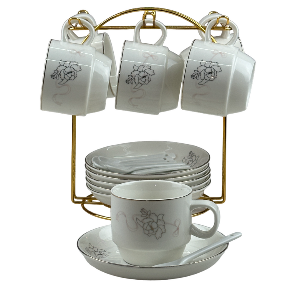 Set De Té x18 Pz Con Soporte Dorado Diseño Rosa