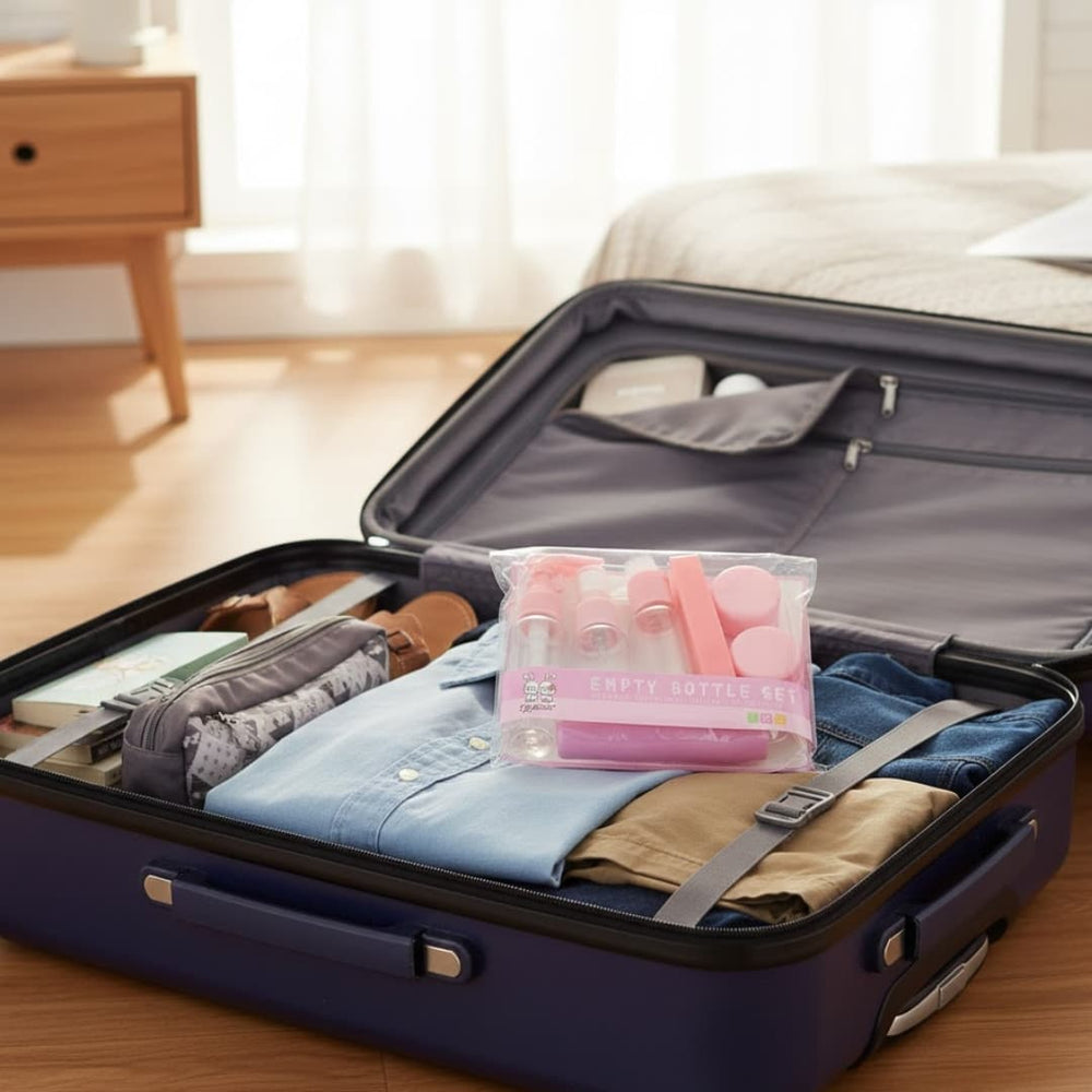 Incluye botellas de 50ml, frascos pequeños de 10ml, herramientas de aplicación y una práctica funda transparente con cierre. Perfecto para shampoo, crema, sérum, gel, loción, entre otros.