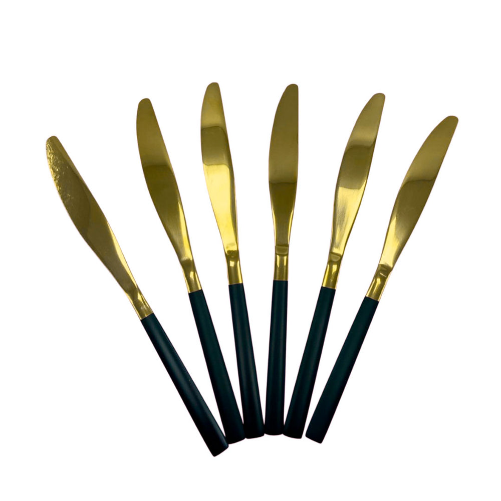 Añade un toque de sofisticación y distinción a tu mesa con el Set x6 Cuchillos Madrid Negro con Dorado! Este set elegante y moderno está diseñado para los amantes de los detalles refinados, combinando un diseño minimalista en negro mate con un toque de lujo gracias al acabado dorado en el extremo de cada cuchillo.
